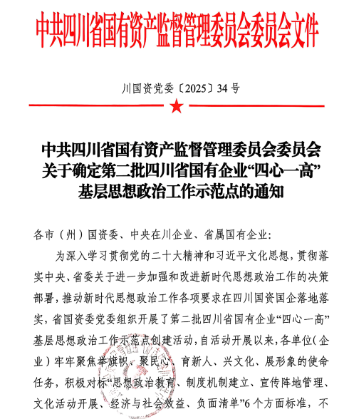 近日,四川省國資委黨委印發(fā)《關(guān)于確定第二批四川省國有企業(yè)“四心一高”基層思想政治工作示范點(diǎn)的通知》,確定56個單位為第二批四川省國有企業(yè)“四心一高”基層思想政治...